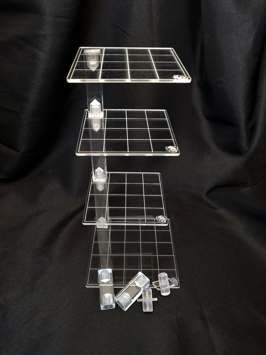 Our 3D Combat Riser Set comes with LASER-ETCHED gridlines allowing the clear stands to disappear into the background. The combination of plates and multiple, interchangeable solid acrylic rods with rod connectors allows the player or DM multiple height configurations. Our set is made of durable clear acrylic and is manufactured right here in the US! Each deluxe set comes with (1) 5×5″ Bottom, (2) 4×4″ Mid, & (1) 4×4″ Top plates, (2) 2″, (1) 3″, (2) 4″ solid acrylic rods & 2 rod connectors. Rods are interchangeable with Single Flyers, Risers, and connectors. The possibilities are endless!